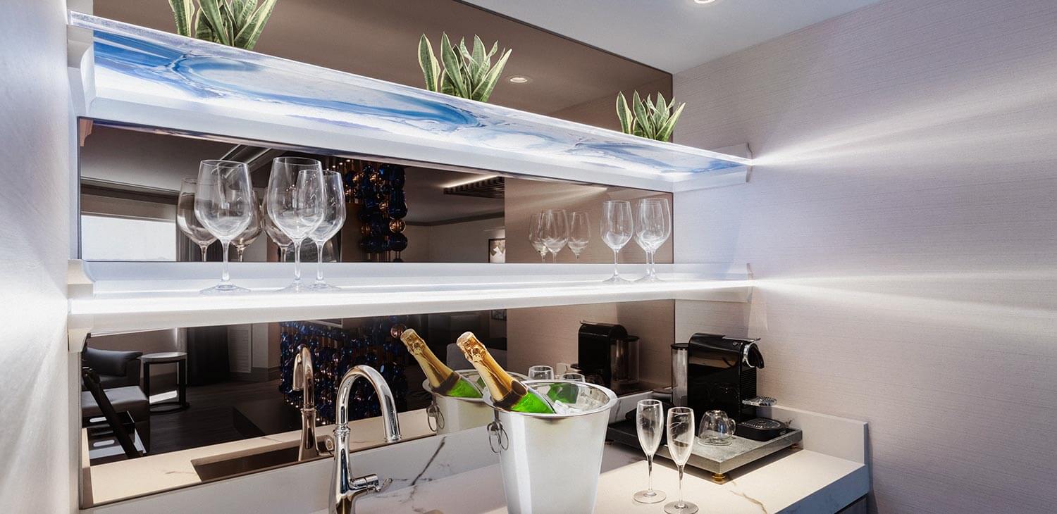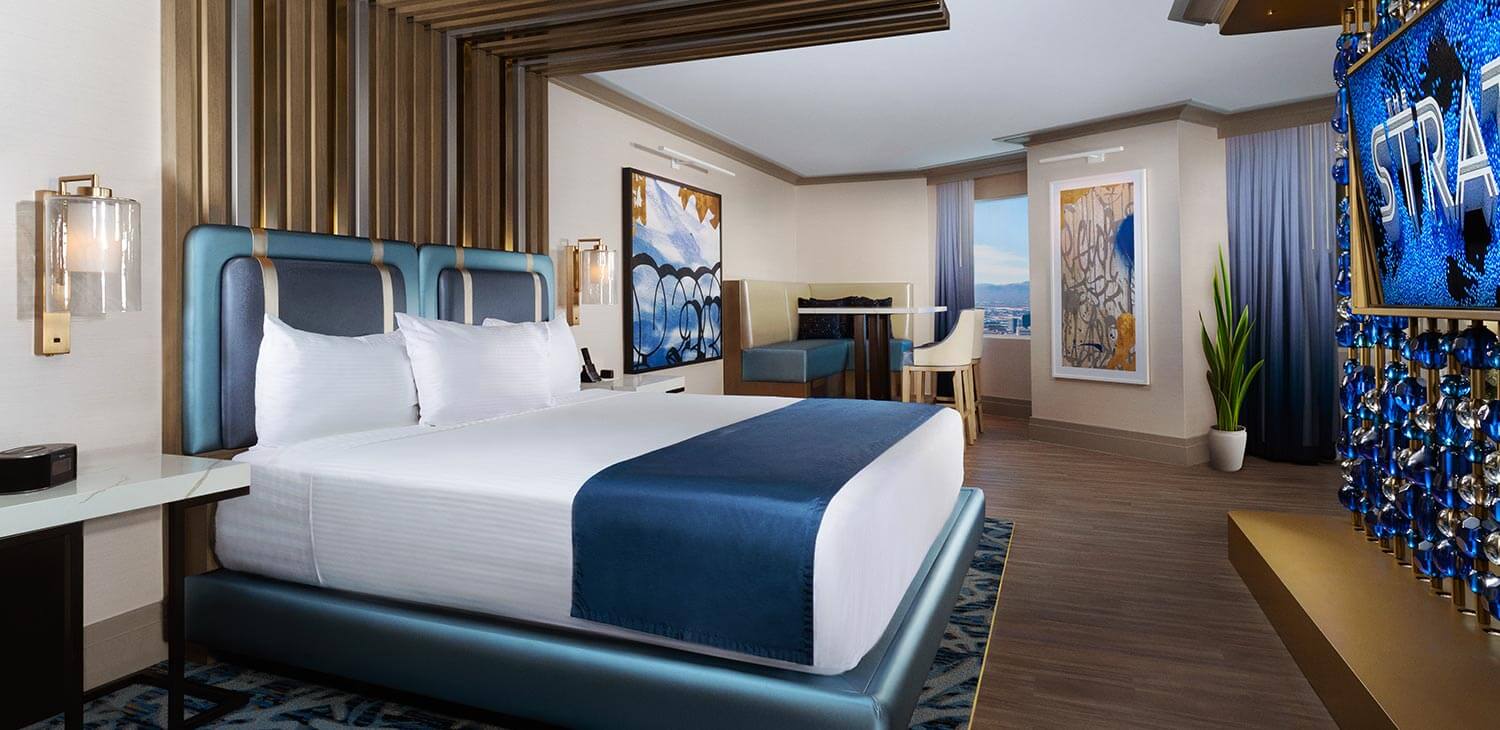 Experience the Vegas Blvd in the comfort of this suite. Wet bar, living room, and booth add flair to be enjoyed by you and your guests. Everything about this room screams sophistication and elegance.